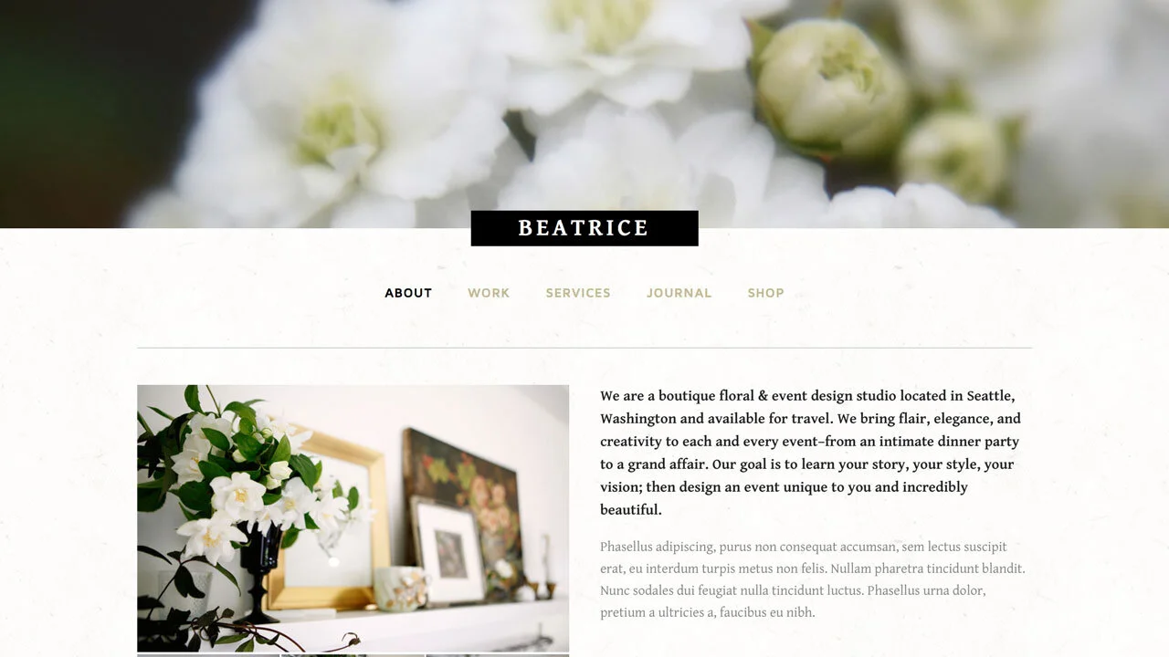 “Beatrice is a simple yet sophisticated template with a balanced layout. The template offers customization of many details, and is most suited for businesses and blogs.”